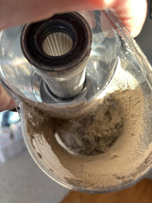 Dual dust cups separate hair from dust and a locking rotor protects the brush. Hair is collected without clogging so suction stays strong during long sessions.